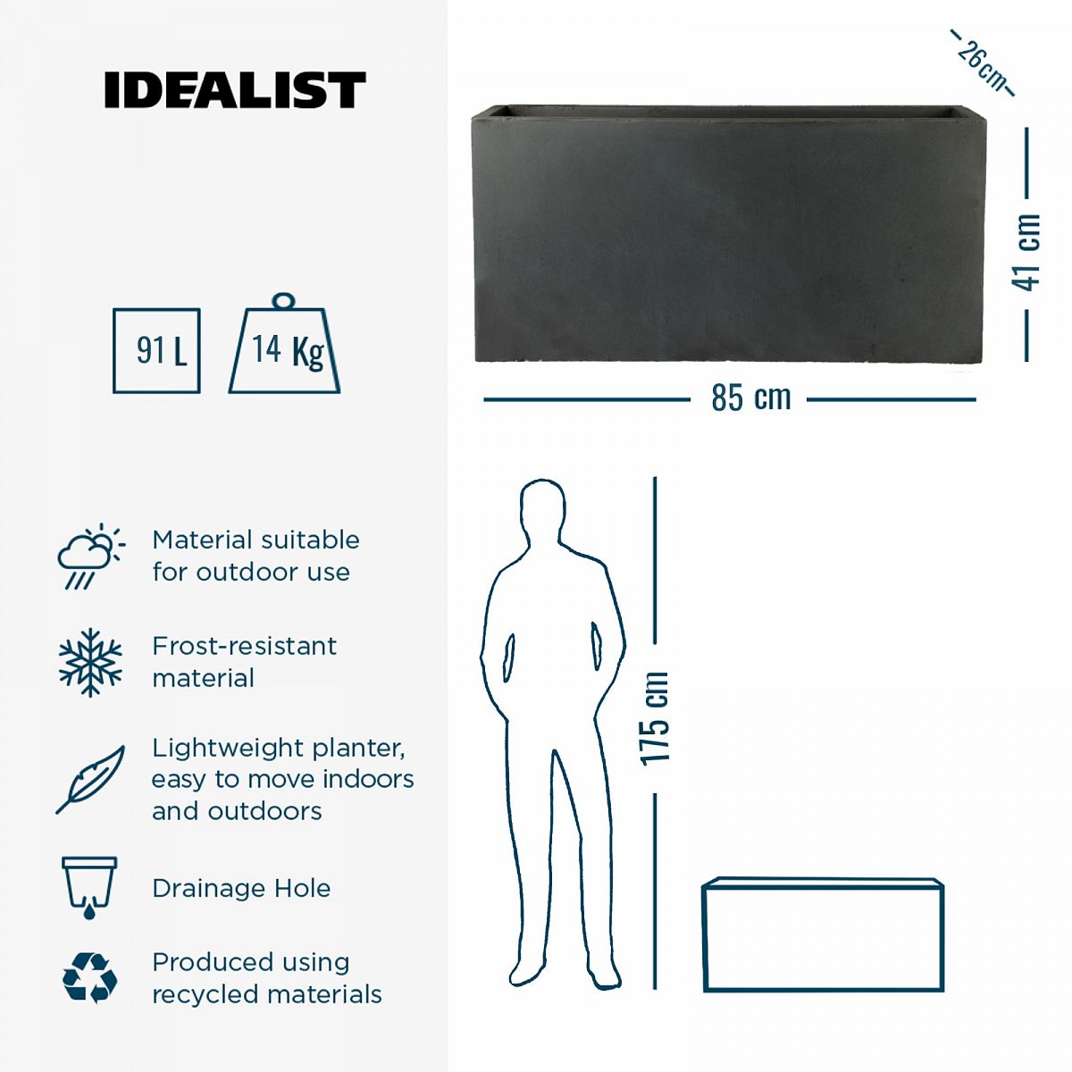 IDEALIST Lite Contemporary Trough Garden Planter, Faux Lead Light Concrete Outdoor Large Plant Pot H41 L85 W26 cm, 91L